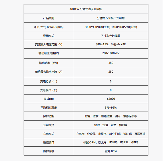 产品定制:输出最大功率20-480kw,可实现多种功率配置方案,满足客户定制化充电需求。